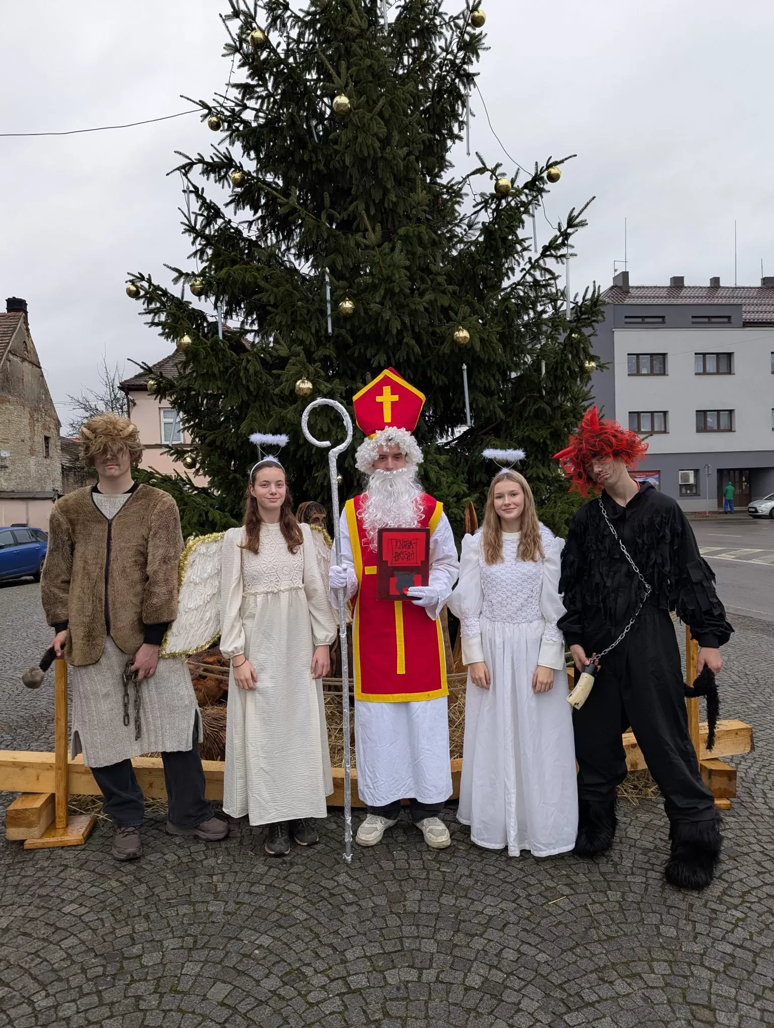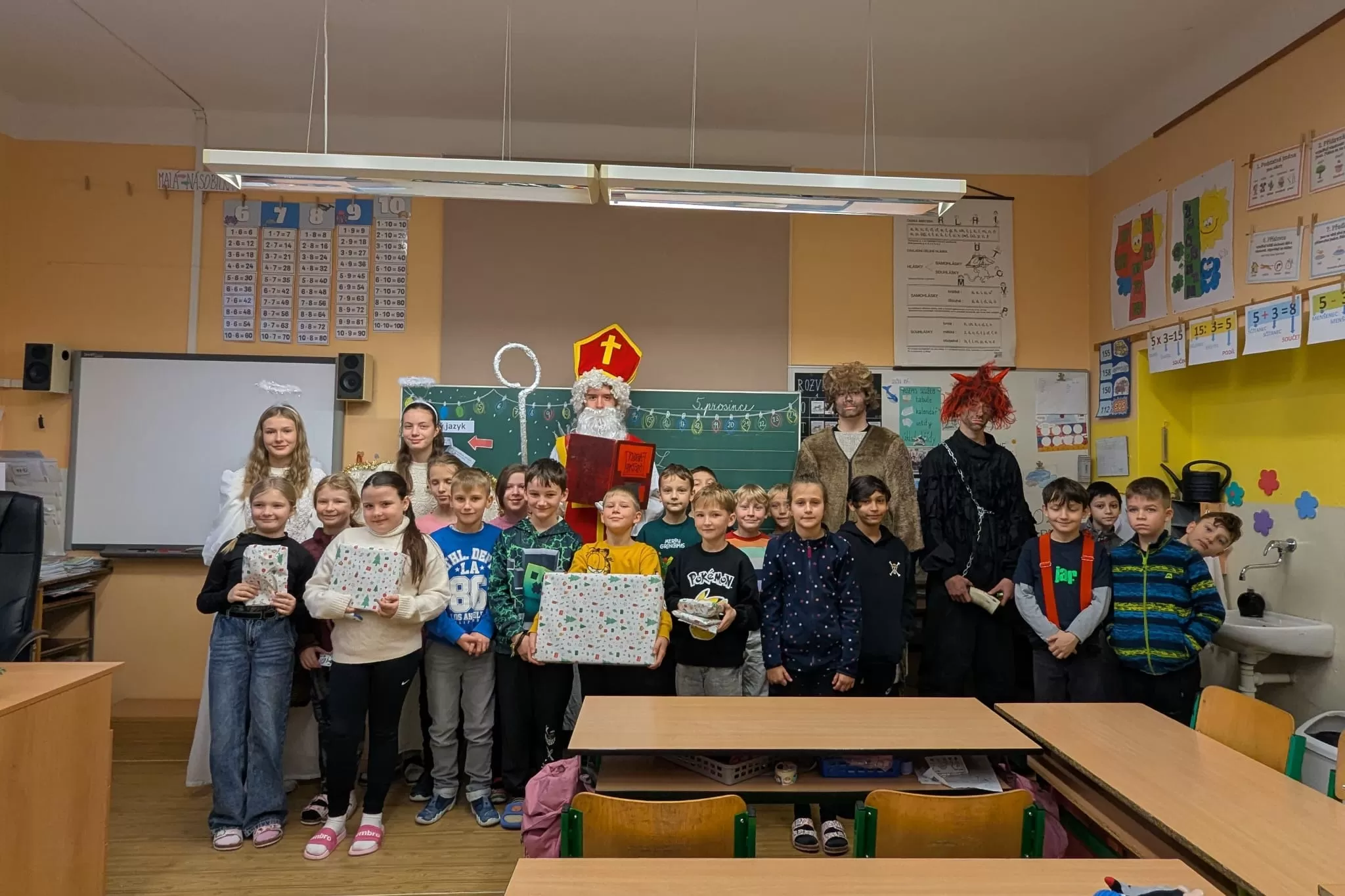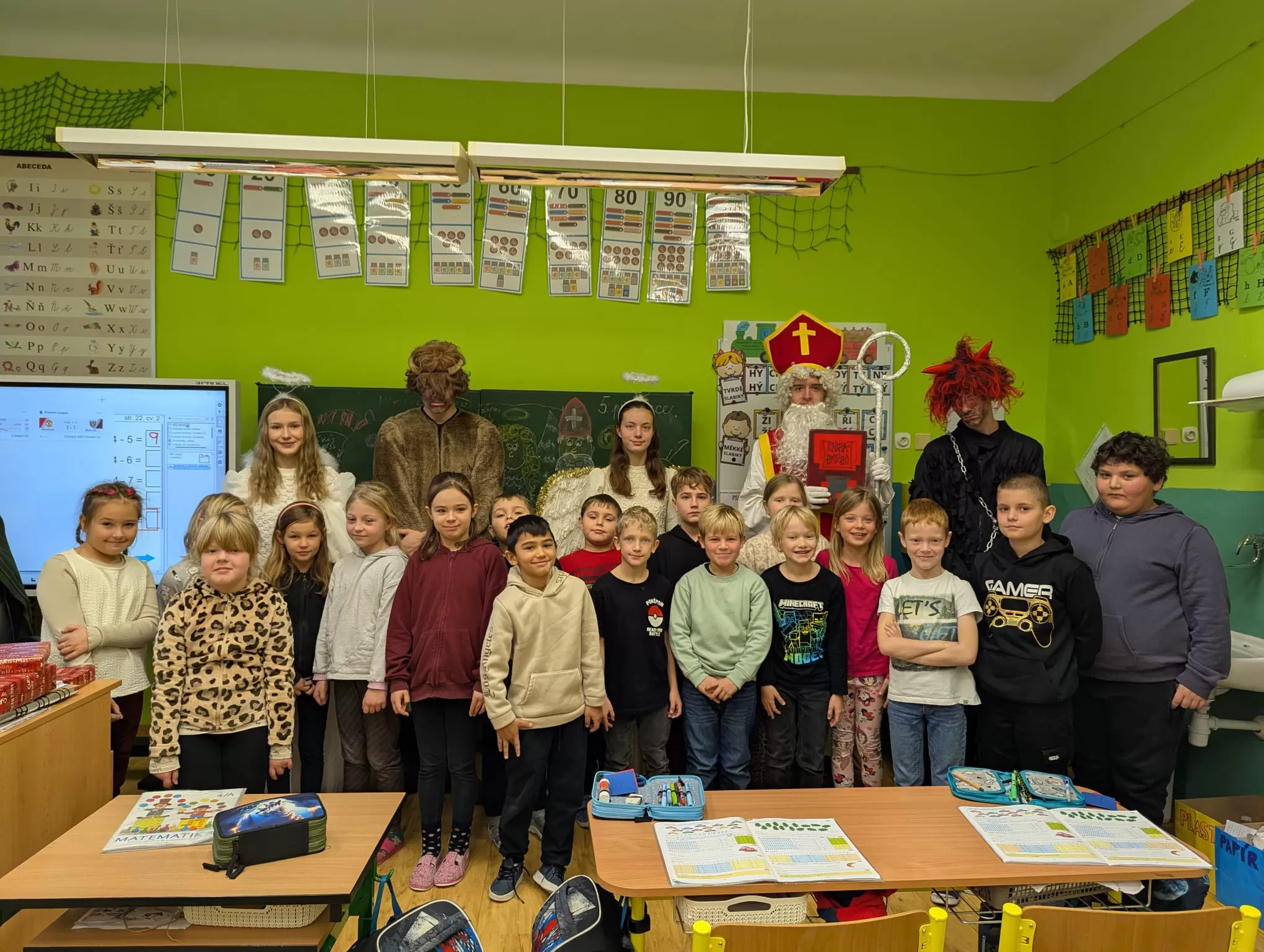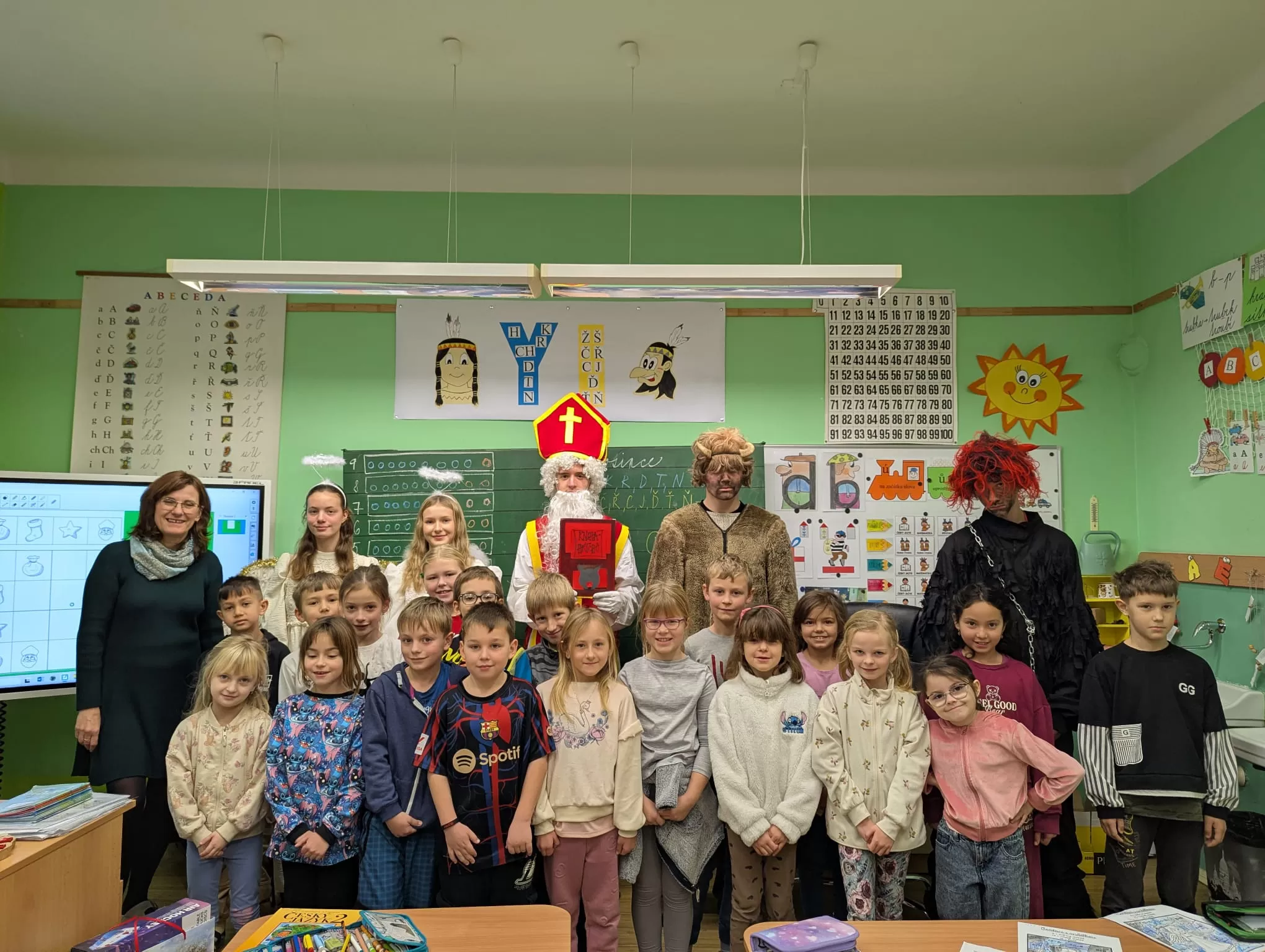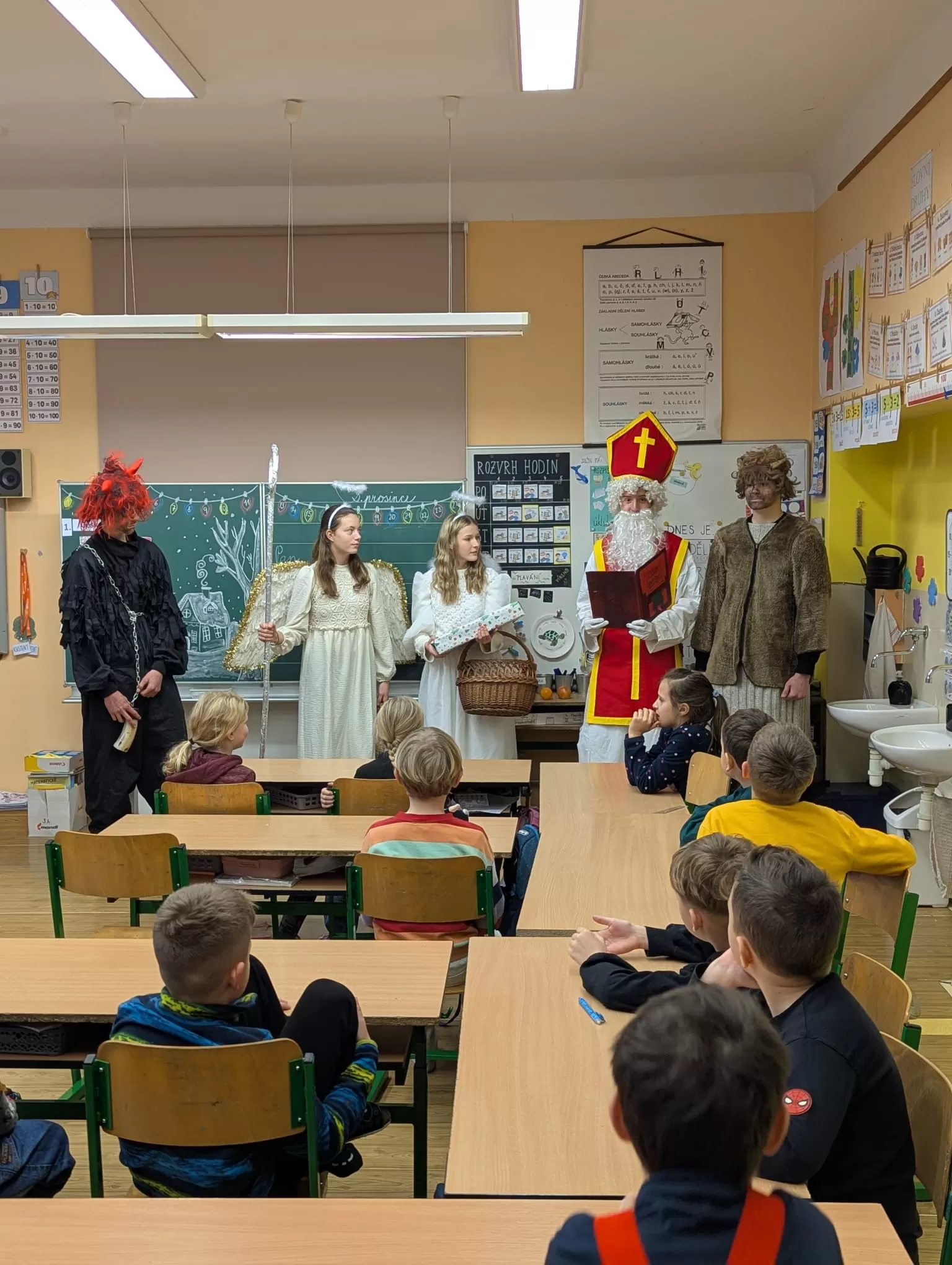 V pátek 5. prosince zavítal na naši školu Mikuláš v doprovodu andělů a čertů. Společně obešli třídy na budově B, kde je děti přivítaly písničkami. Mikuláš s sebou měl Knihu hříchů, kterou mu z pekla přinesli čerti. Z ní pak přečetl, kdo občas zlobí a kdo si naopak zaslouží pochvalu. Andělé děti povzbudili a čerti slíbili, že letos nikoho neodnesou. Všechny děti dostaly ve třídách malý dárek a zbyl čas i na společnou fotografii. Den zakončil chutný oběd, který s úsměvem uvařily čtyři čertice.