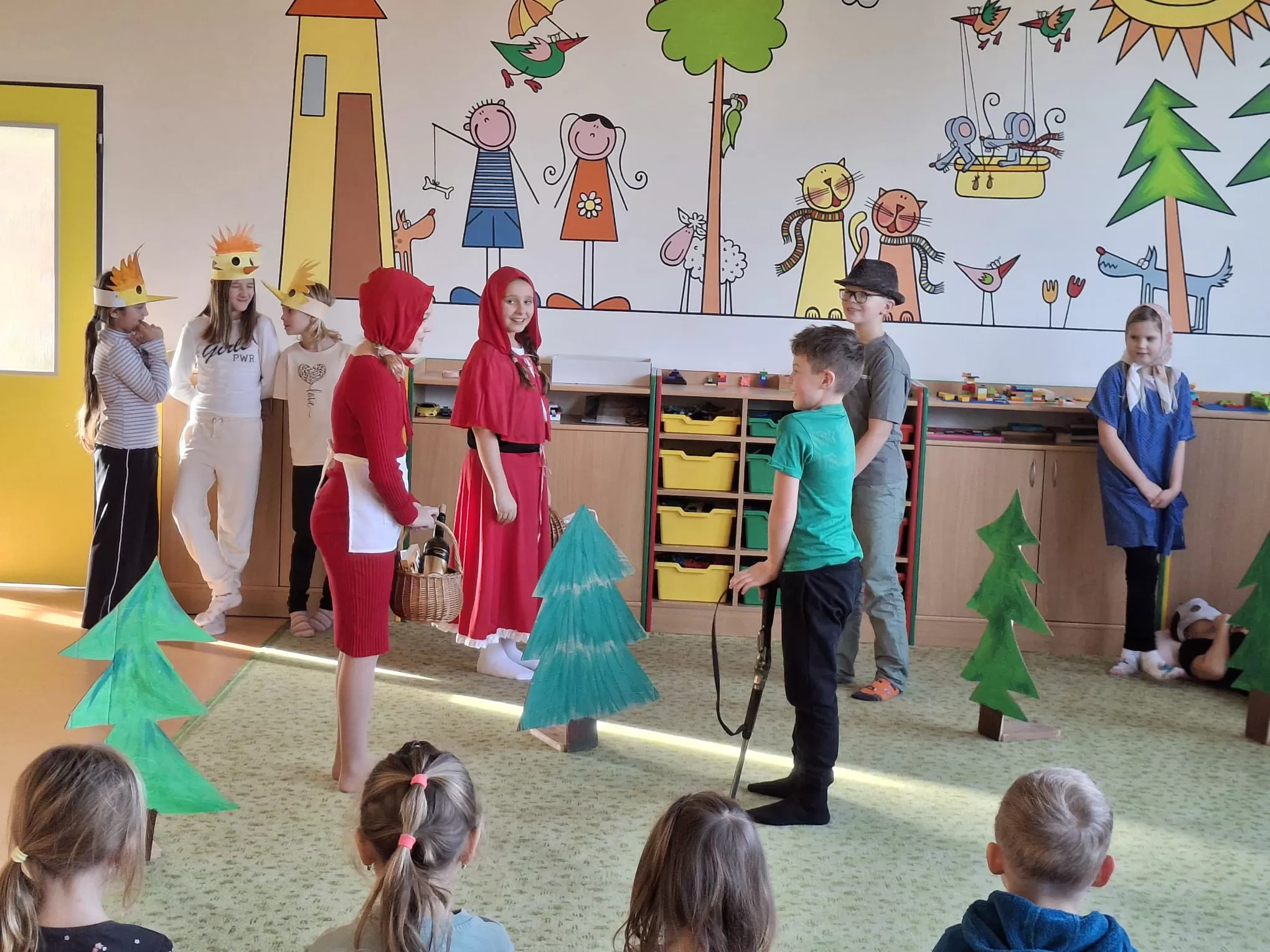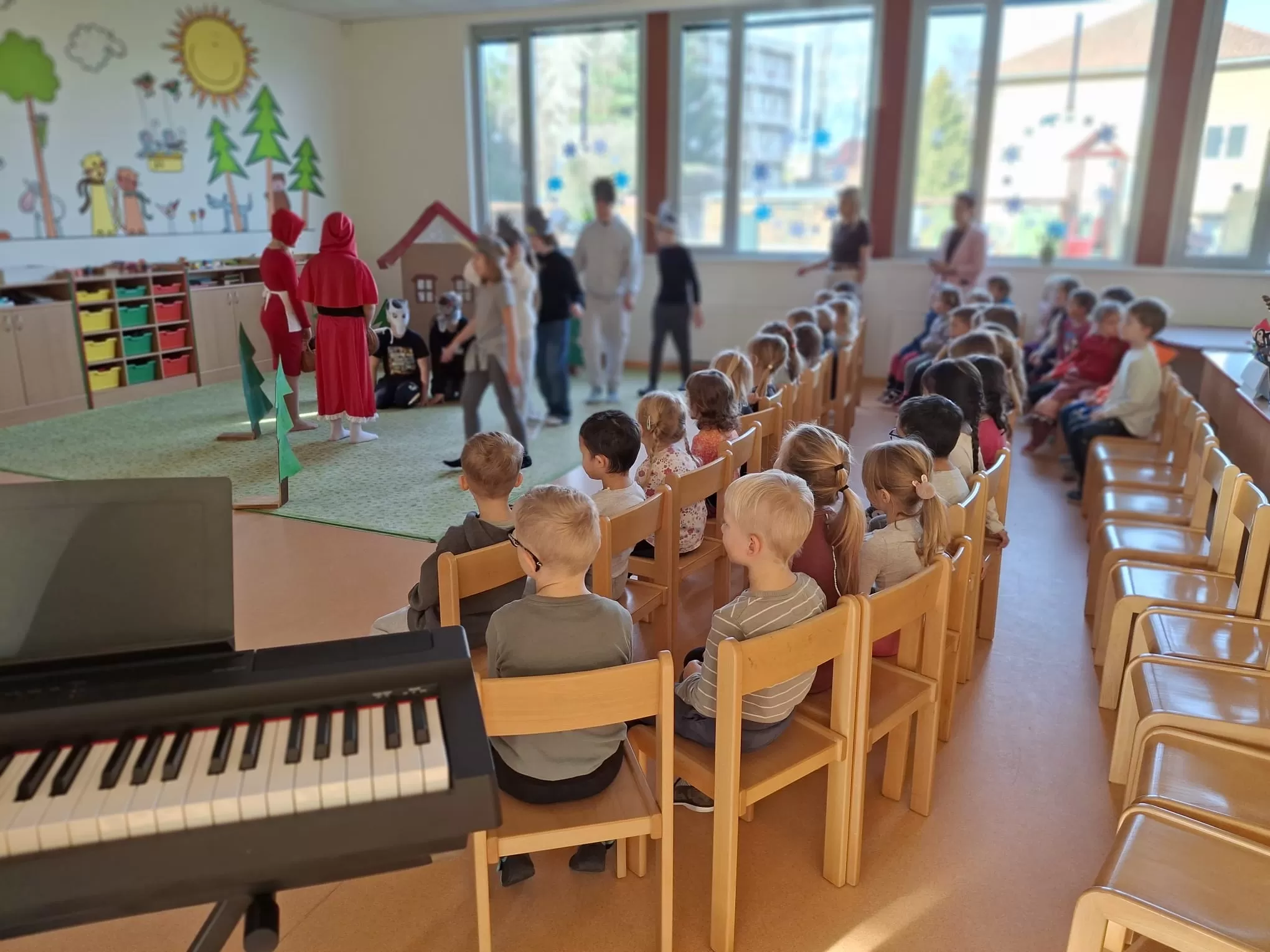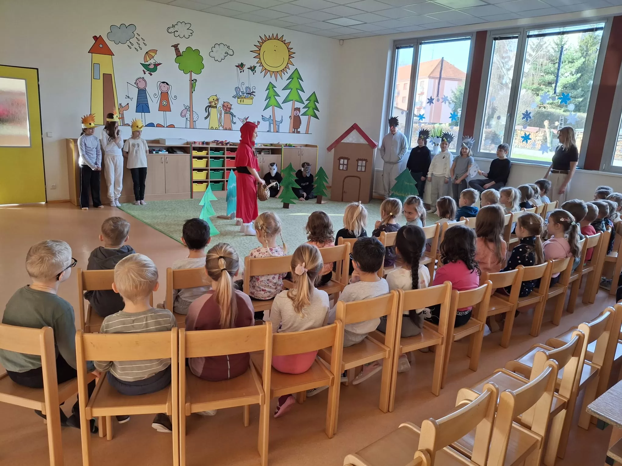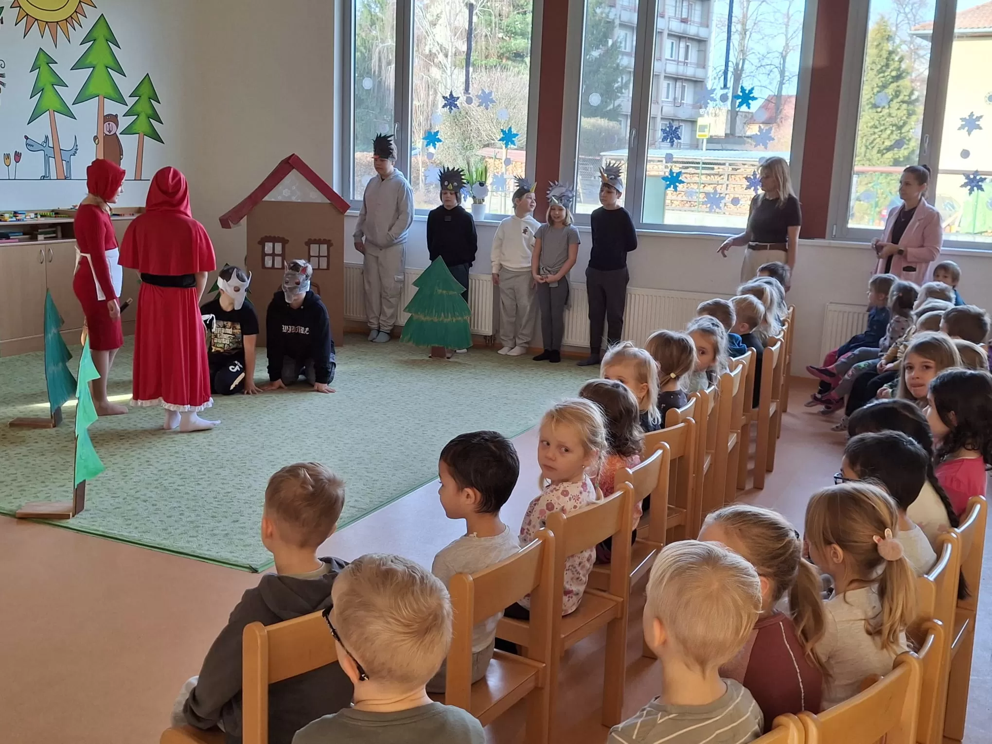 V úterý 9. prosince k nám zavítaly děti z mateřské školy, které zhlédly divadelní představení třídy 4. B s názvem Červená karkulka. Pro čtvrťáky šlo o jejich první veřejné vystoupení před publikem. Na hercích byla znát nervozita, která však postupně ustoupila soustředěnému výkonu. Děti se svých rolí zhostily s nadšením a velkou snahou. Hudební pohádka měla jasný děj a malé diváky zaujala od začátku až do konce. Mladší děti sledovaly své starší kamarády se zaujetím a zájmem. Po skončení představení odměnily účinkující hlasitým potleskem. Malým hercům přejeme, aby svůj úspěch zopakovali i na čtvrtečním jarmarku.